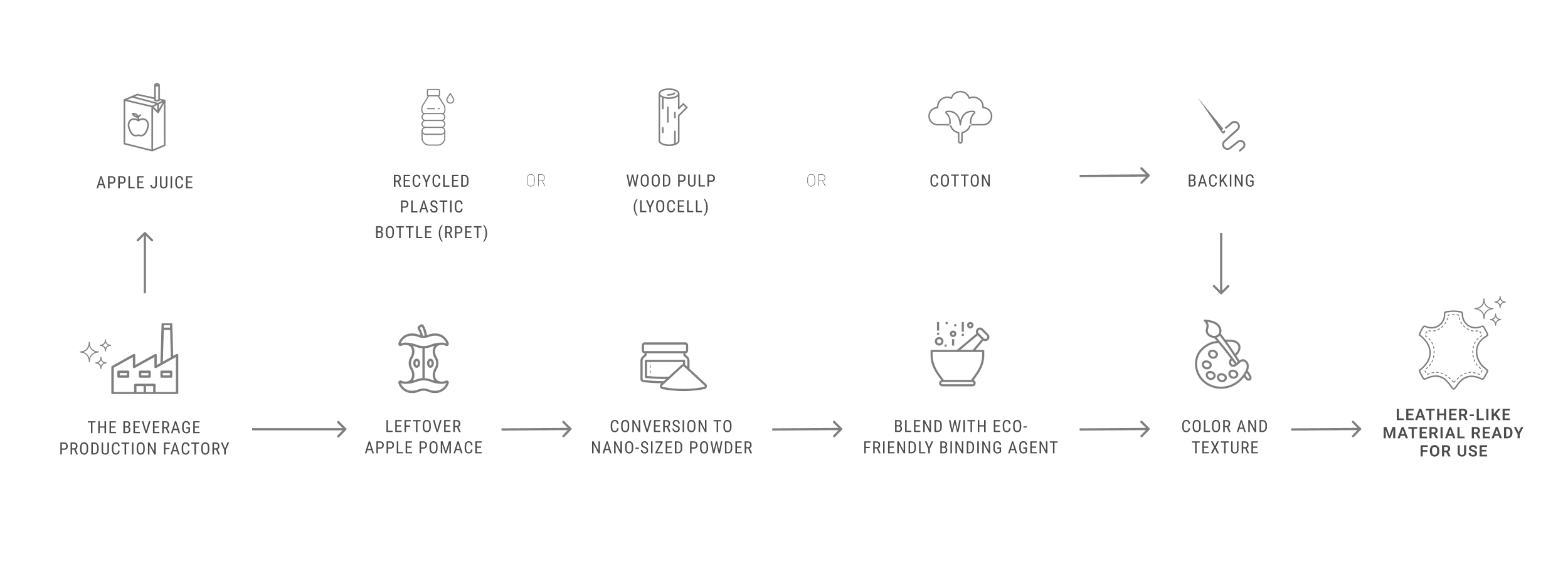 With production partners, we collect the pomace and dehydrate it. The dried product is then mixed with binding agents and laminated on recycled, plant-based fabric.